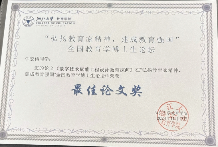 我院博士生牛宏伟的论文《数字技术赋能工程设计教育探问》入选本次论坛,并受邀在“人工智能时代背景下教育强国建设”分论坛作学术报告。报告在教育强国背景下结合数字技术与工程设计教育的发展历史与改革契机,从何以必要、何以可能、如何践行三个维度对人工智能、大数据、云计算等新兴数字技术如何赋能工程设计教育的问题展开了前提性反思与终极性追问,由技术对教育的通用赋能讨论转向更加聚焦的探索。汇报后,浙江大学的评委教师和《中国远程教育》期刊的主编对该汇报的选题意义、研究方法、分析框架和具体内容等做出了点评,该论文获得“最佳论文奖”。