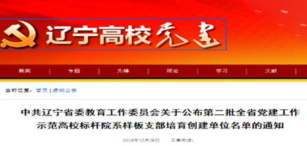 2019年12月26日,辽宁省委教育工委公布了第二批全省高校党建工作示范高校、标杆院系、样板支部培育创建单位名单,我院教工党支部入选“全省党建工作样板支部”培育创建单位。