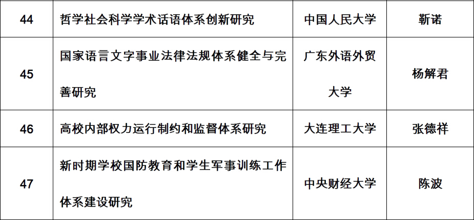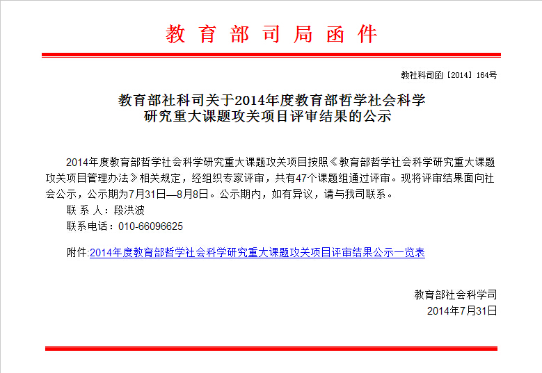 近日,教育部社科司公布了2014年度教育部研究重大课题攻关项目评审结果,2014年重大课题设立52个招标方向,共有47项课题获批立项。我校人文与社会科学学部张德祥教授担任首席专家的“高校内部权力运行制约和监督体系研究”项目获得立项,这是我校首次获批教育部研究重大课题攻关项目,填补了我校在教育部文科领域重大项目的空白。