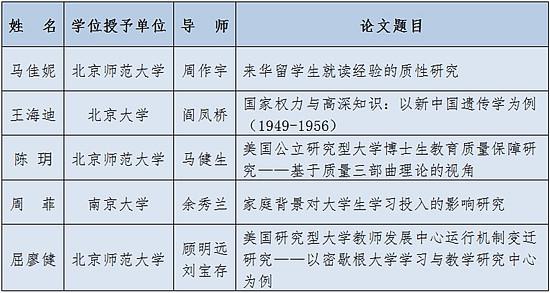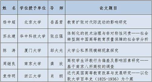 此次论文评选工作于2016年3月启动,经专家通讯评审、专家会议评审会审定,共评选出5篇“高等教育学”优秀博士学位论文,同时,评选出“高等教育学”优秀博士学位论文提名奖5篇(见附表1、2)。