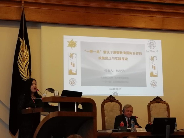 我院韩梦洁副教授做了题为“‘一带一路’倡议下高等教育国际合作的政策变迁与实践探索”的主旨报告,阐述了中国高等教育国际合作政策的变迁历程,指出新时代高等教育在“一带一路”倡议下的实践探索,并以大连理工大学与白俄罗斯国立大学的合作模式作为典型案例进行分析。