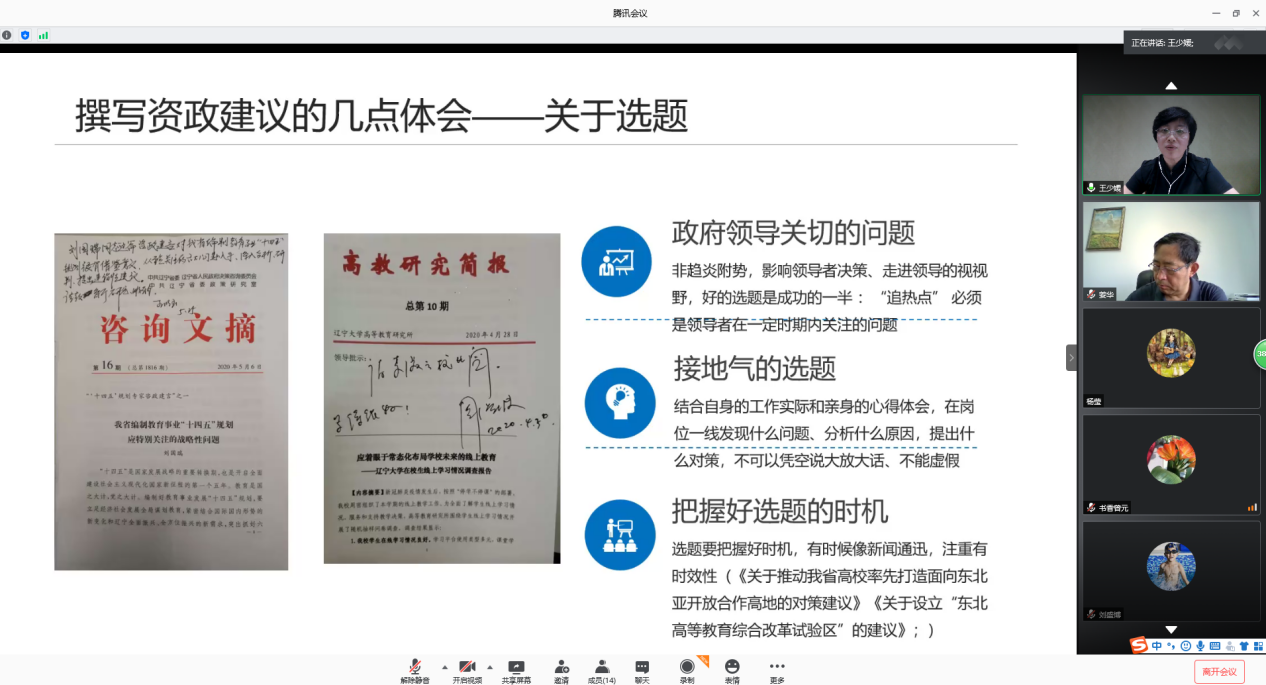 出席此次线上会议的主要专家有:大连理工大学高等教育研究院院长副院长何晓芳副教授、刘盛博副教授、苏永建老师,吉林大学高等教育研究所任增元教授、沈阳师范大学教育硕士研究生院书记唐卫民教授、大连海洋大学的的彭绪梅教授、沈阳师范大学的李晓虹副教授和辽宁教育学院的杨玉老师等。