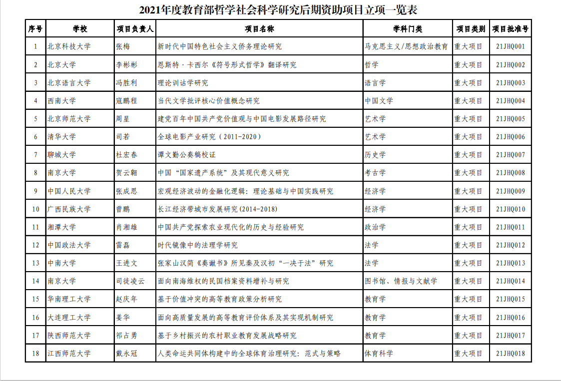 2021年12月22日,教育部社会科学司公布了“2021年度教育部哲学社会科学研究后期资助项目”名单,共有100项批准立项,其中重大项目共20项。我院姜华教授主持申报的“面向高质量发展的高等教育评价体系及其实现机制研究”项目获得重大项目立项资助。该项目构建了基于创新视角的“制度-知识-人才”的高等教育评价体系,为实现高等教育的高质量发展提供了系统化的保障。