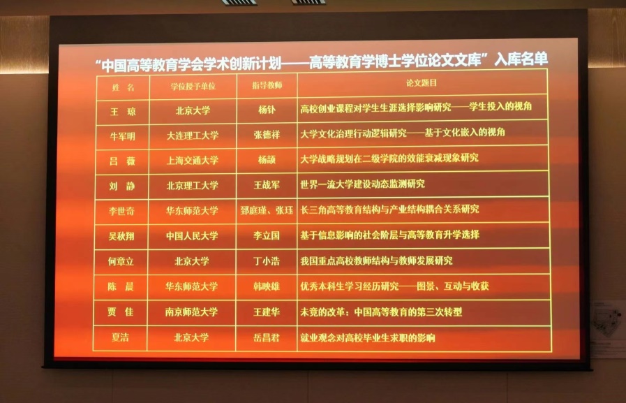 本次论坛设立“大学校长论坛”“学者论坛”和“博士生论坛”三大平行论坛。作为此次论坛的重要组成部分,“2022高等教育国际论坛年会”平行论坛之“博士生论坛”的一项重要议程是公布“中国高等教育学会学术创新计划——高等教育学博士学位论文文库”入库名单,并为入库导师和博士代表颁发纪念牌。我院张德祥教授指导的2021届博士毕业生牛军明的博士论文《大学文化治理行动逻辑研究——基于文化嵌入的视角》,被中国高等教育学会学术创新计划“博士学位论文文库”评选为入库论文。